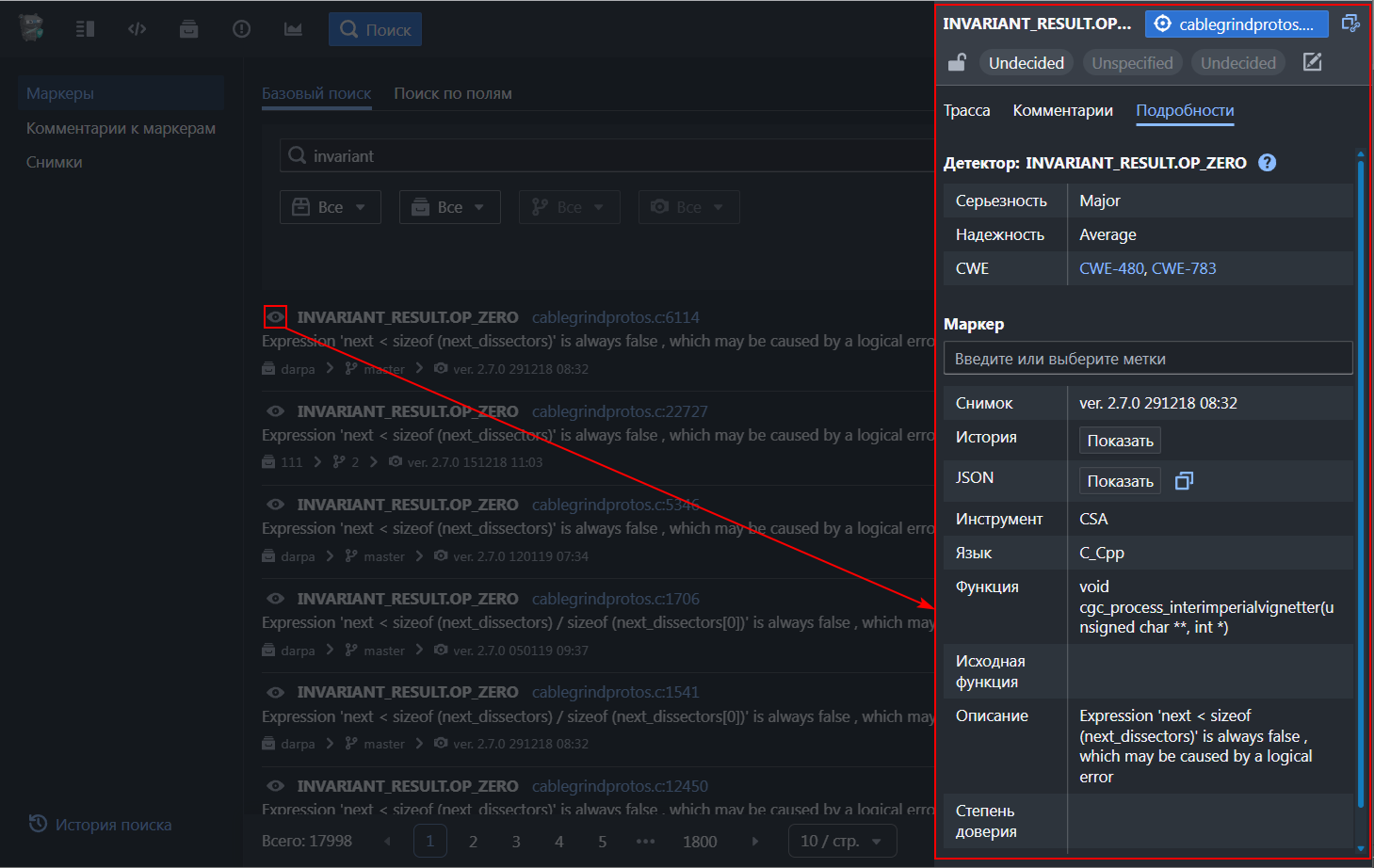 - Код – просмотр снимков исходного кода, связанного с результатами анализатора Svace;